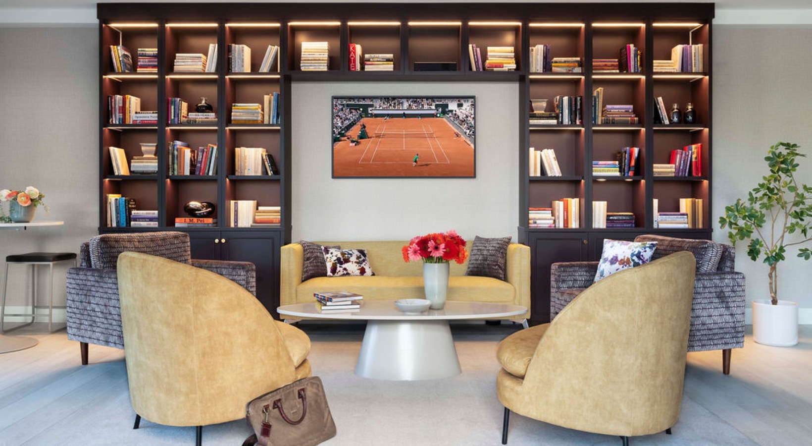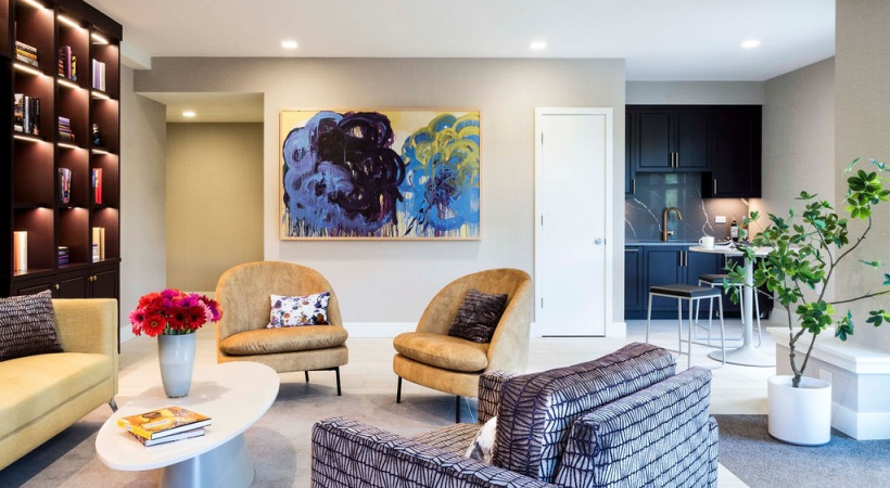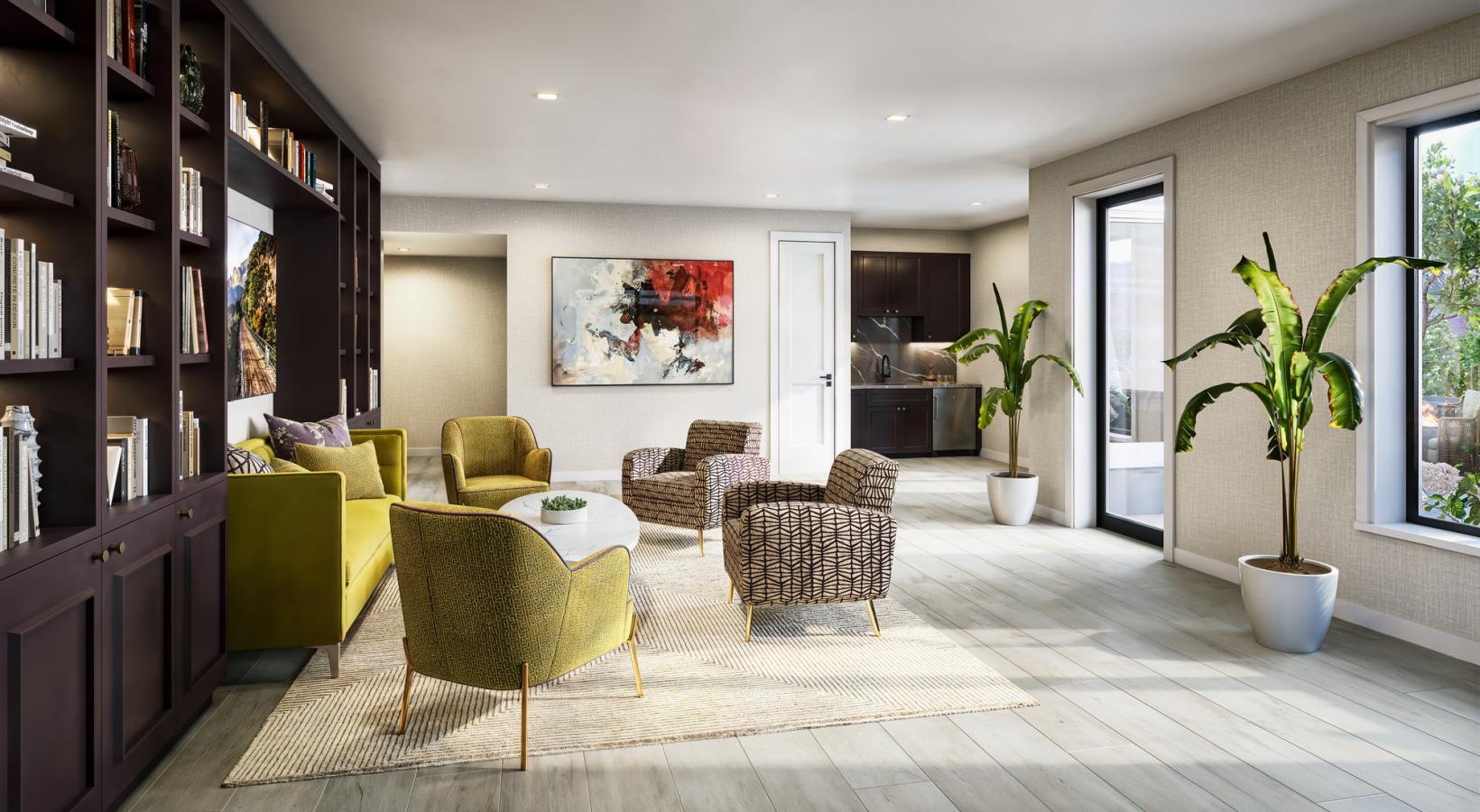 • 1.	The Charley Apartments | A modern leasing office at The Charley Apartments in Allston MA features patterned and yellow armchairs, a white oval coffee table with flowers and books, built-in lit wall shelves, abstract art, a kitchenette, and a green indo