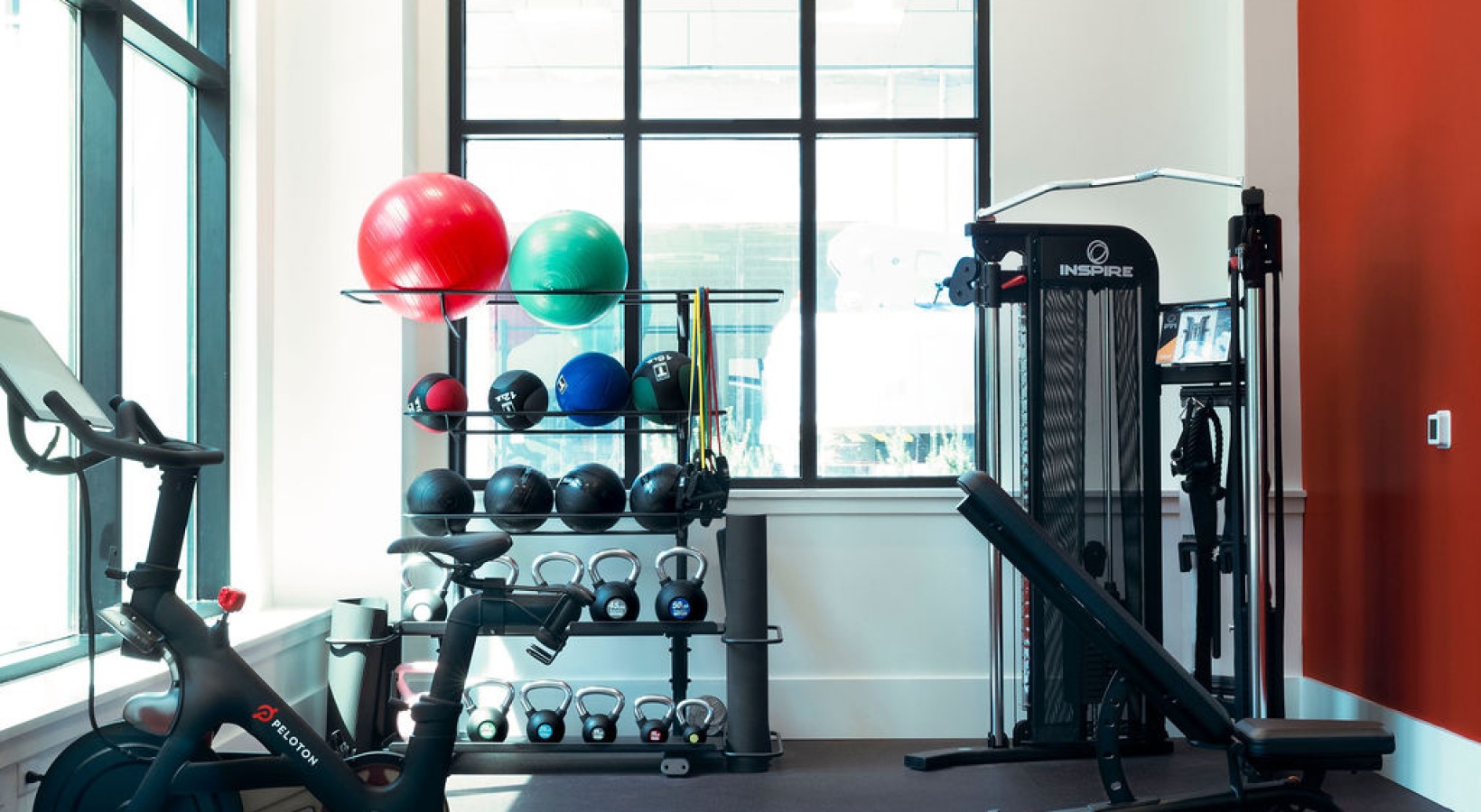 • The Charley Apartments | A modern gym at The Charley Apartments in Allston MA features cardio machines, a rack of colorful exercise balls and dumbbells, and strength training equipment, all set by large windows with natural light. | Apartments with Fitnes