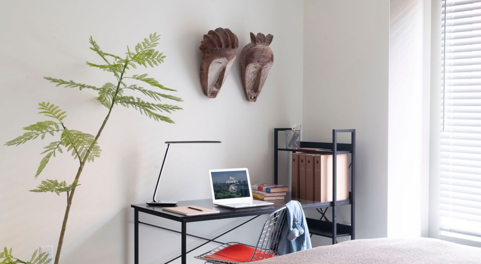 • The Charley Apartments | A minimalist home office at The Charley Apartments in Allston MA features a small desk, laptop, books, and lamp beside a shelf of files. Two wooden masks hang above, while a potted plant and sunlight add natural elements to the co