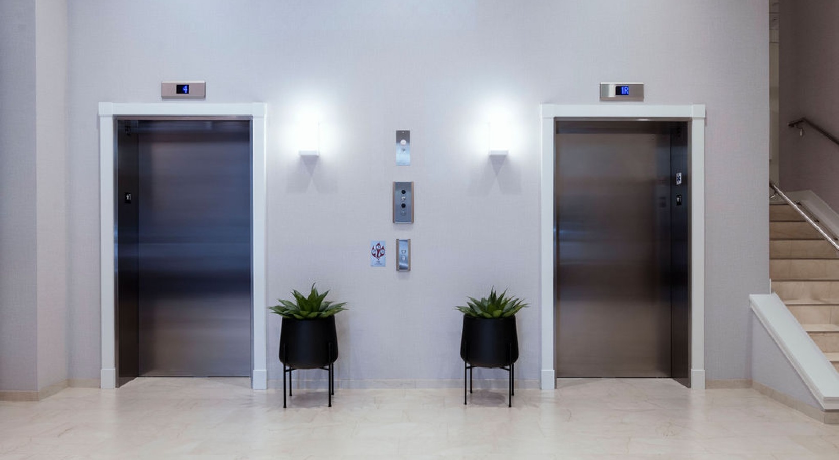 • The Charley Apartments | Two stainless steel elevator doors are set in a light-colored wall at Charley Apartments in Allston MA. Each elevator has a button panel and a potted plant in front, with a staircase to the right. The floor is tiled. | Wheelchair