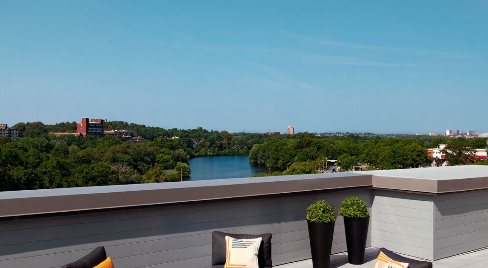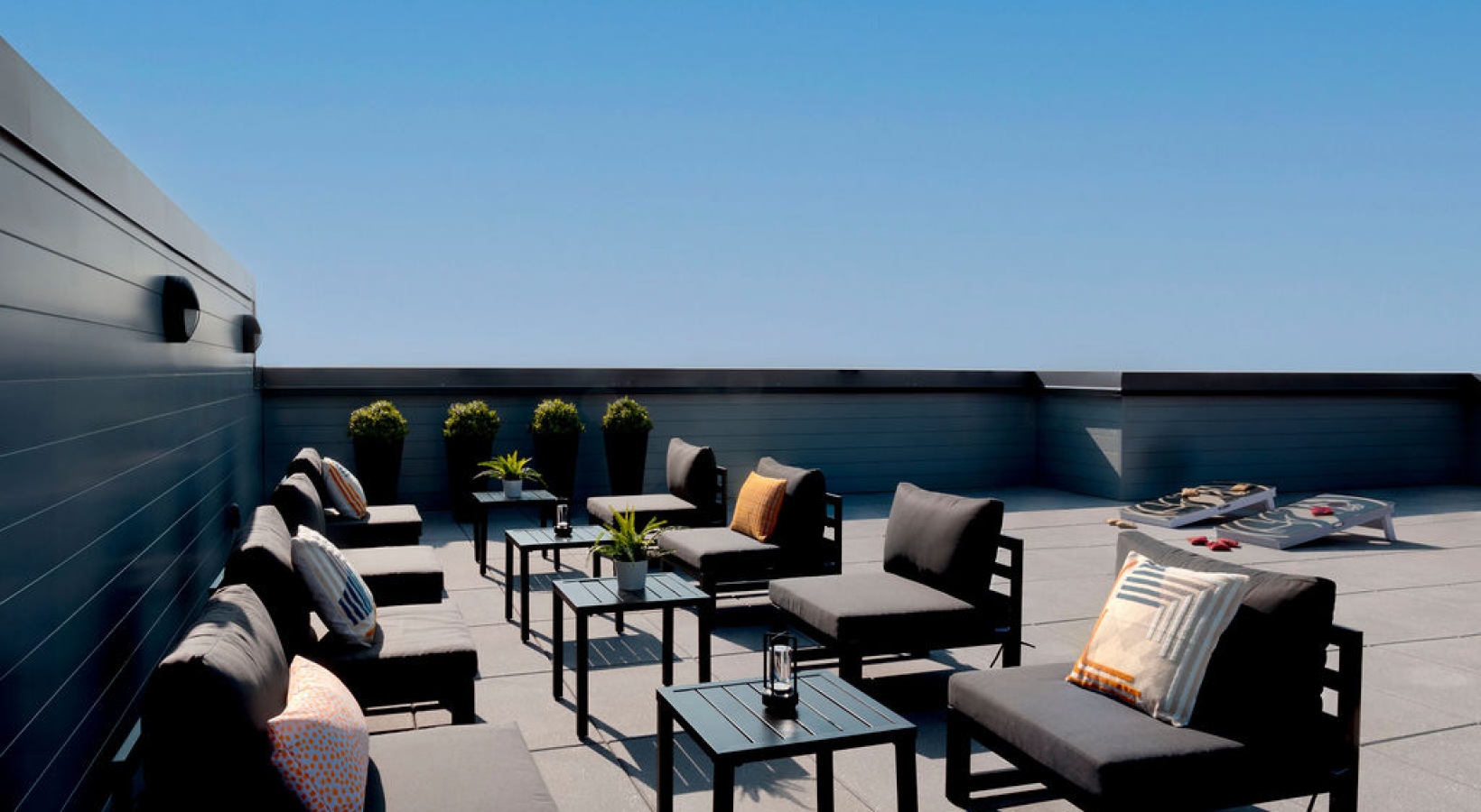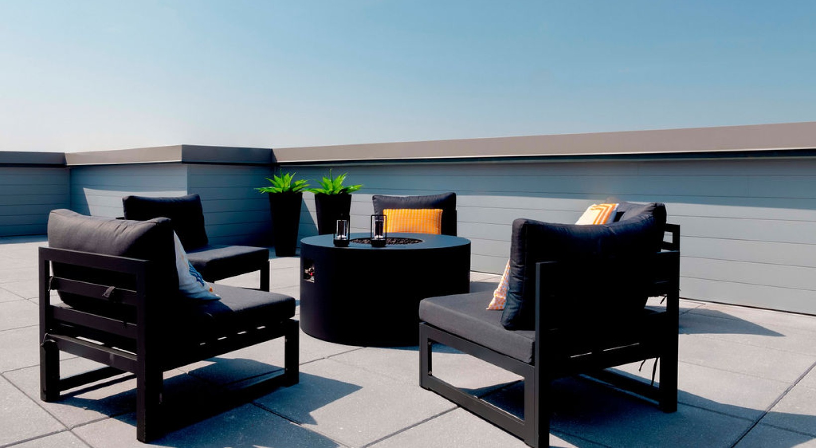 • The Charley Apartments | Modern rooftop patio at Charley Apartments in Allston MA with black lounge chairs, small tables, potted plants, and decorative pillows, set against a clear blue sky and minimalistic railing. Two lounge chairs are in the background
