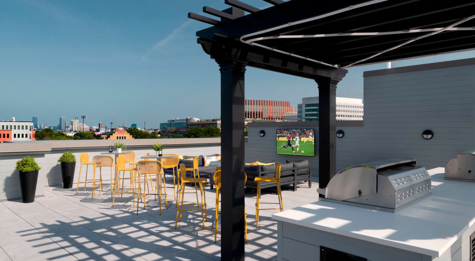 • The Charley Apartments | A modern rooftop patio at Charley Apartments in Allston MA features a pergola, outdoor kitchen, grill, yellow chairs and tables, potted plants, and a large TV screen showing a soccer game against the city skyline backdrop. | Apart