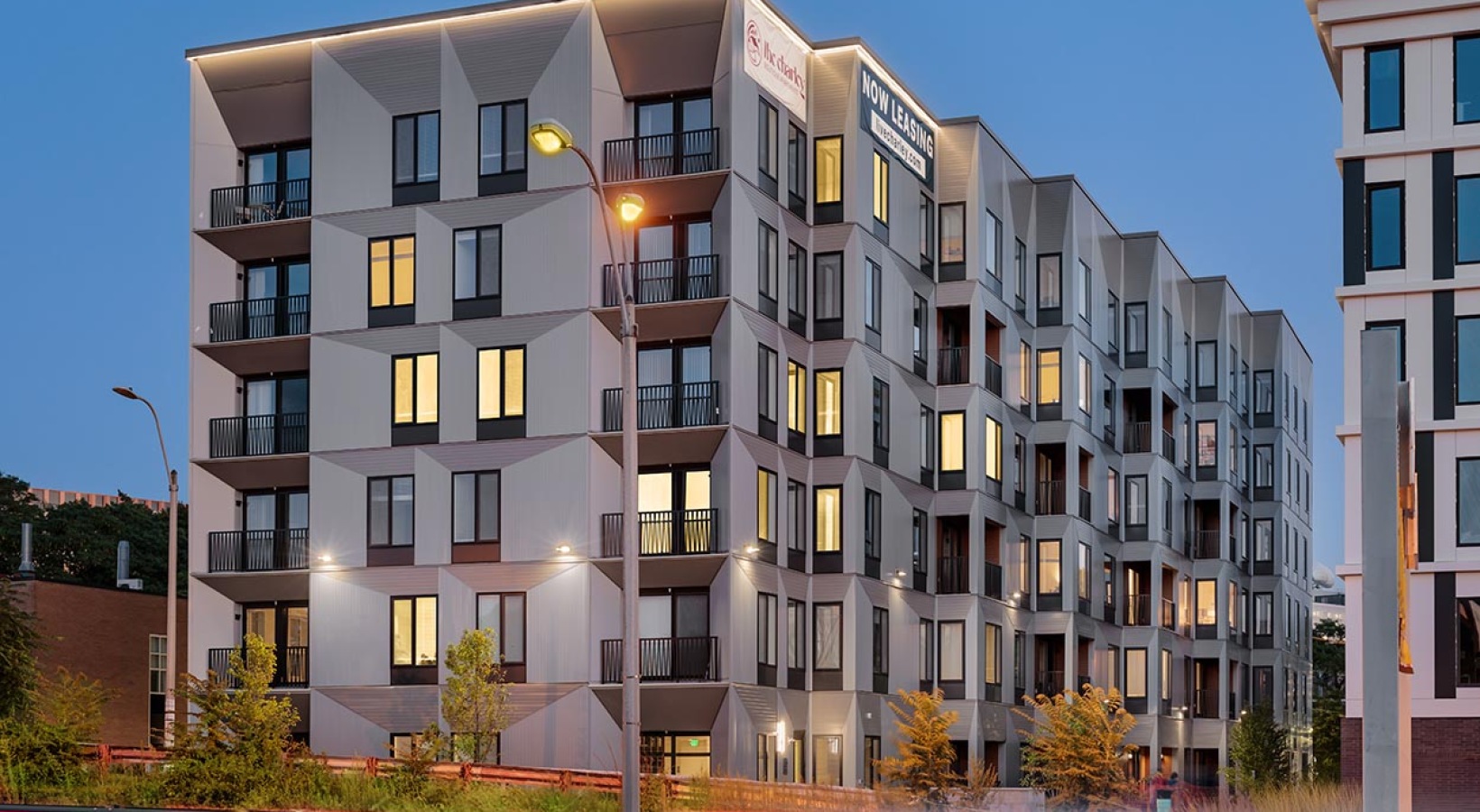 • Modern multi-story apartment building with illuminated windows at dusk, featuring balconies and a geometric facade. Some greenery is visible in the foreground of The Charley Apartments in Allston MA, with light trails from passing vehicles on the street.
