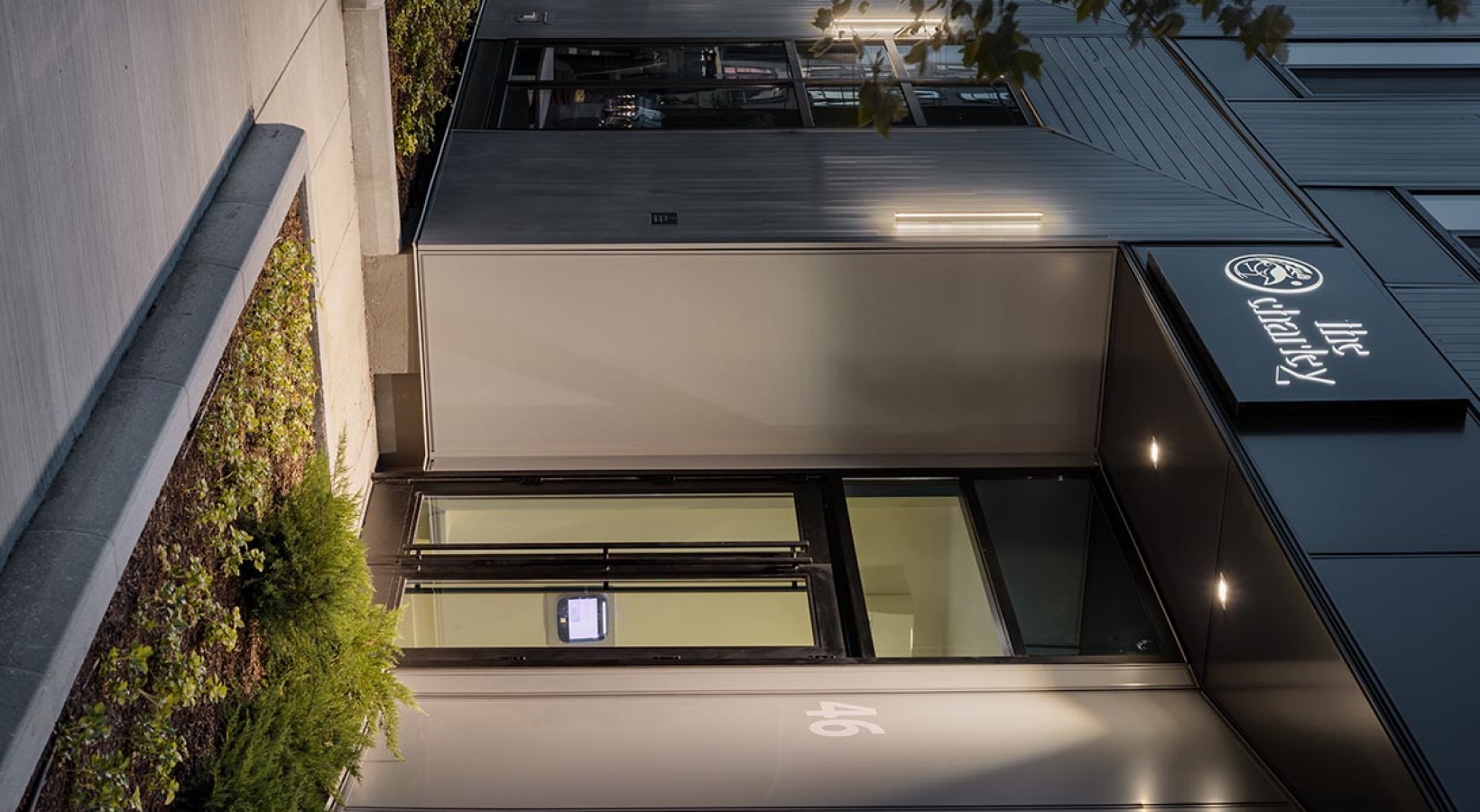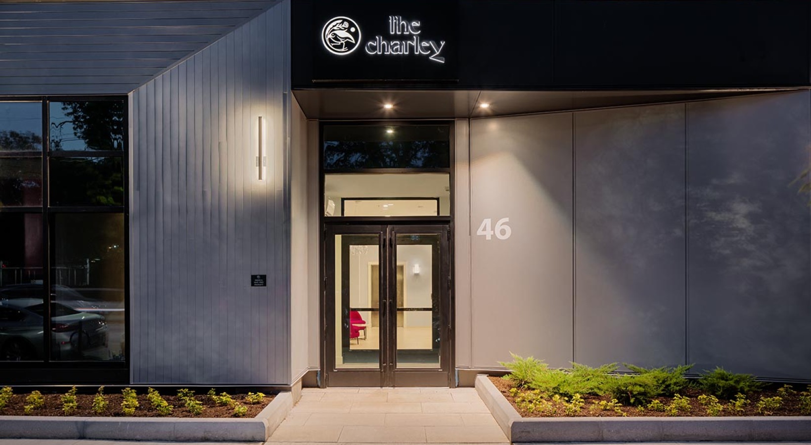 • The Charley Apartments | The entrance to The Charley Apartments in Allston MA features a modern design with the sign The Charley above glass doors, the number 46 on the wall, plants along the walkway, and exterior lights illuminating the area at dusk. | B