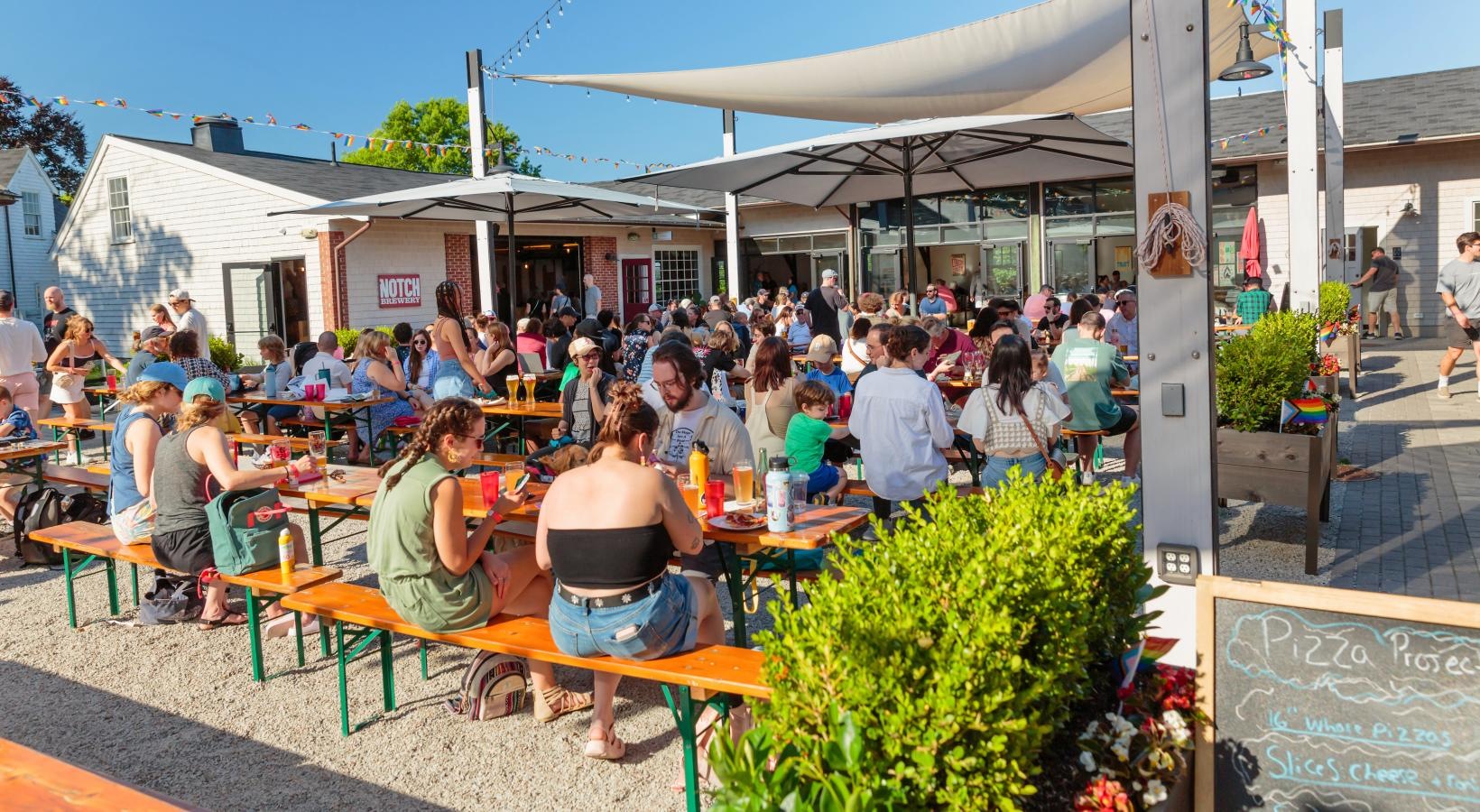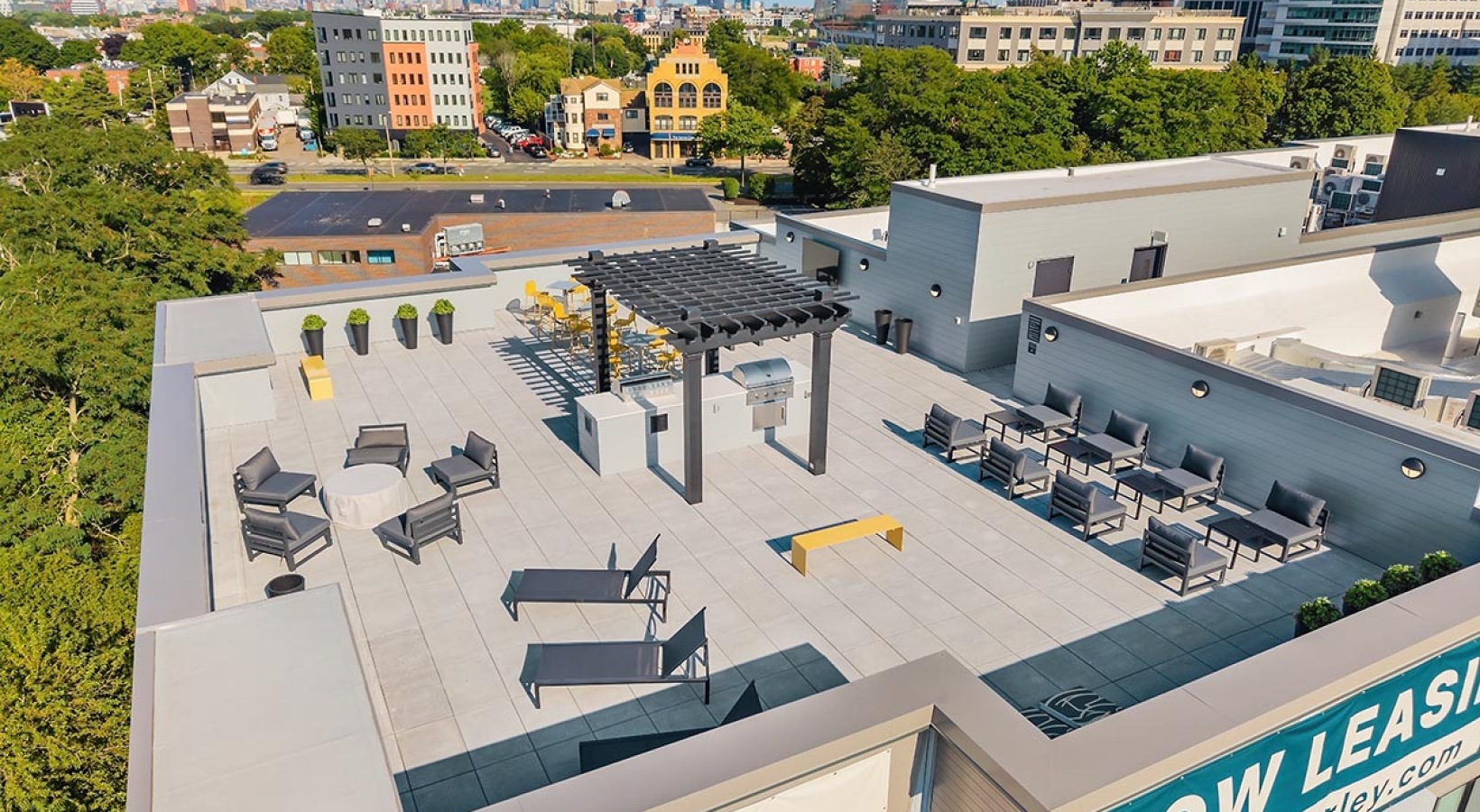 • The Charley Apartments | A rooftop patio at The Charley Apartments in Allston MA features lounge chairs, tables, benches, a pergola, and planters amid city buildings and greenery under a clear sky. A NOW LEASING banner is visible on the building’s edge. |