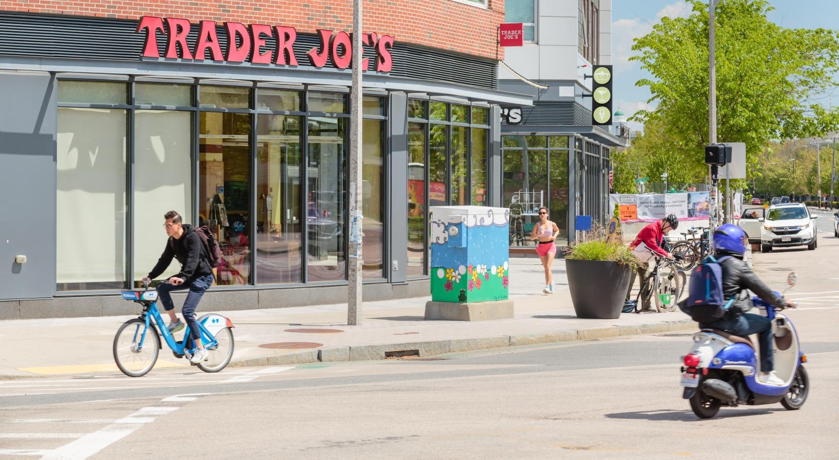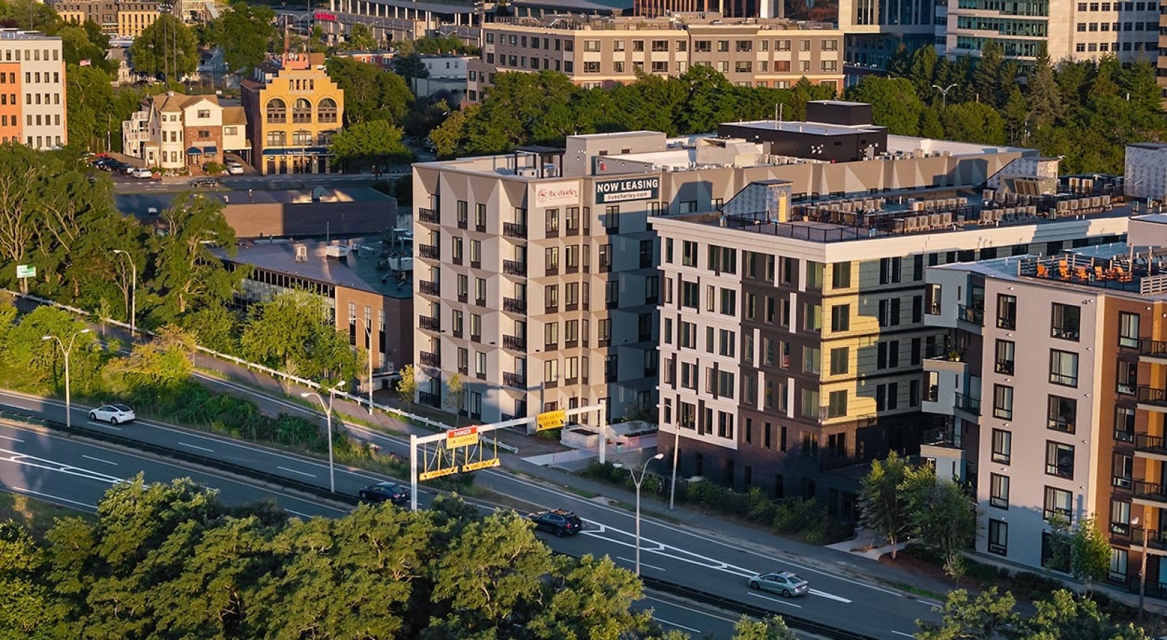 • The Charley Apartments | A cityscape shows The Charley Apartments in Allston MA, with modern buildings, a tree-lined street filled with cars, and older architecture in the background, all bathed in late afternoon sunlight. | Apartments with Air Conditioni