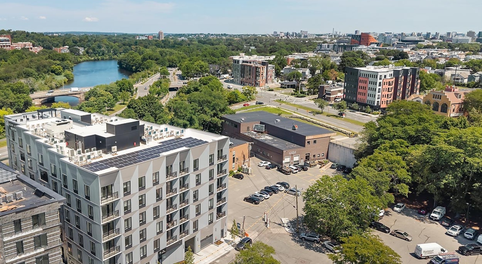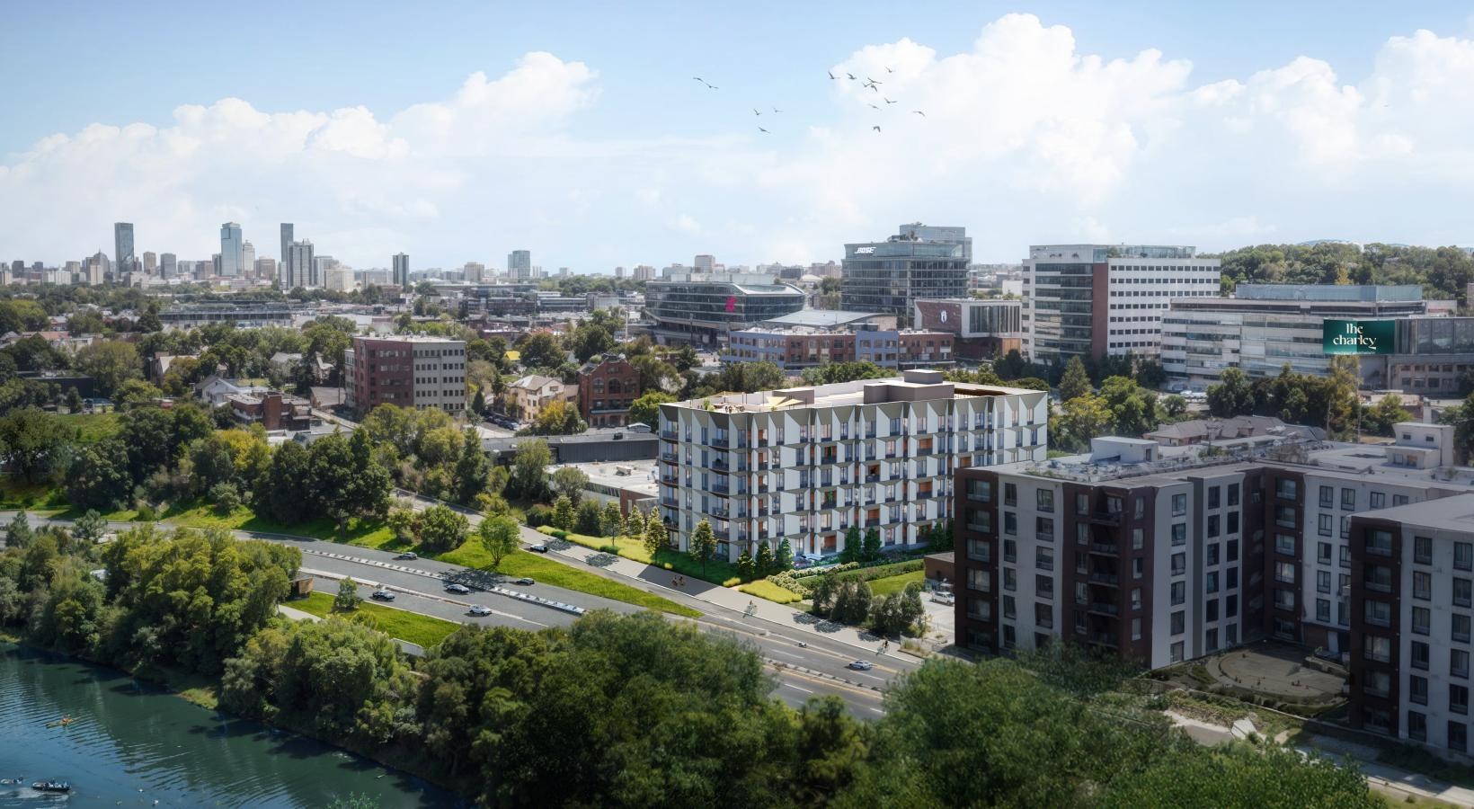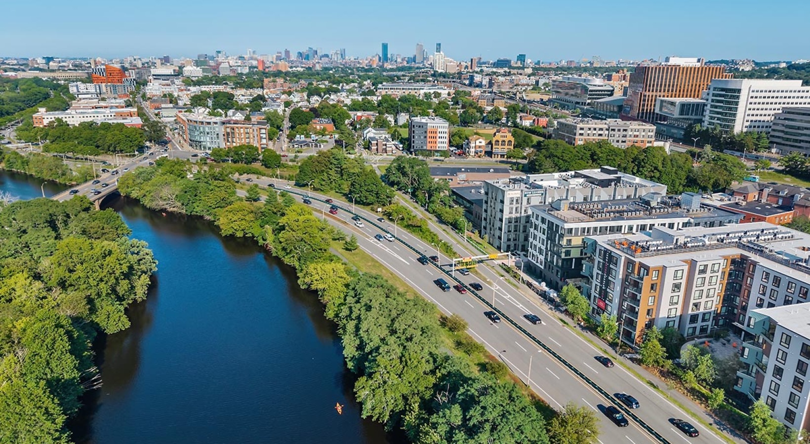 • The Charley Apartments | Aerial view of a city with a river beside a busy road, bordered by green trees and modern buildings like The Charley Apartments in Allston, MA, all under a clear blue sky. | Boston Waterfront Apartments