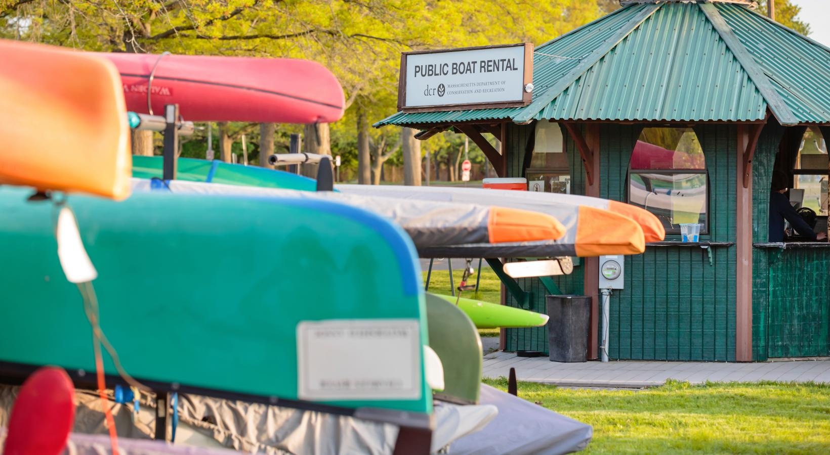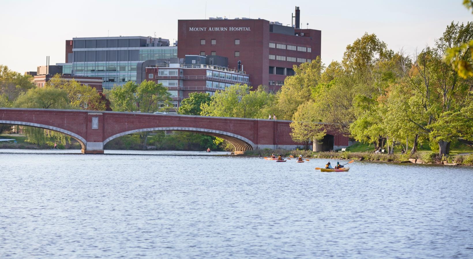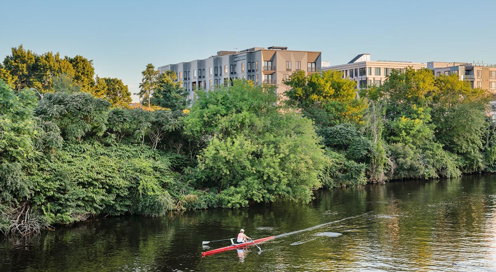 • The Charley Apartments | A person rows a red single scull boat on a calm river, surrounded by green trees with The Charley Apartments in Allston MA visible in the background under a clear blue sky. | Wheelchair accessible Apartments in Boston
