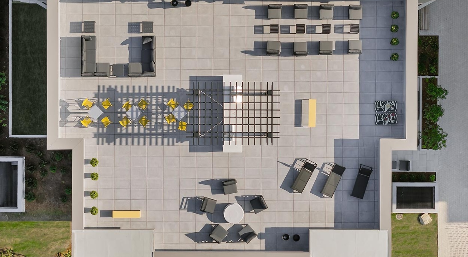 • The Charley Apartments | Aerial view of The Charley Apartments in Allston MA, showcasing a modern rooftop terrace with lounge chairs, seating areas, tables, a pergola, plants, and a fire pit on a large tiled deck surrounded by greenery. | Apartments with