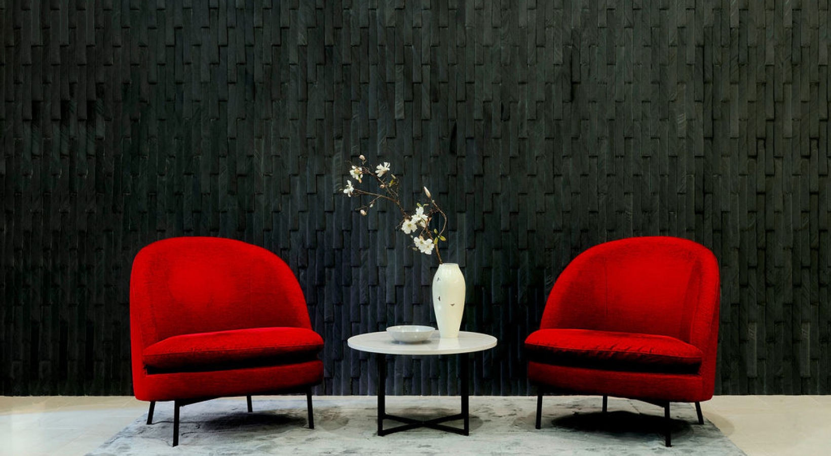 • The Charley Apartments | Two red armchairs on a gray rug with a round white table and a white vase with flowers between them, set against a dark textured wall and a modern ceiling light—an inviting space at The Charley Apartments in Allston MA. | Wheelcha
