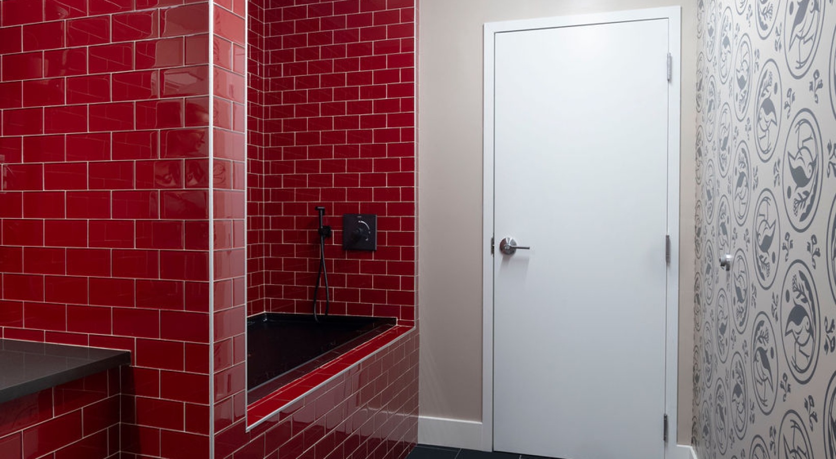 • The Charley Apartments | Modern Pet Spa in Allston MA with glossy red subway tiles around a black bathtub, a white door with a silver handle, and black-and-white patterned wallpaper. The dark-tiled floor lends the space a chic vibe—perfect for an at-home