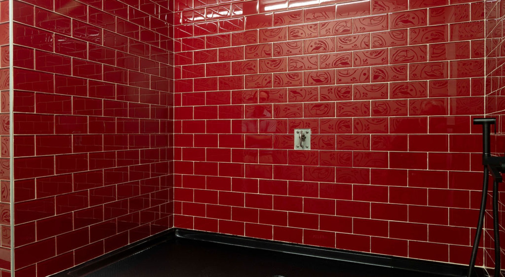 • The Charley Apartments | A pet spa with shiny, dark red subway tiles on the walls, black flooring with a drain in the center, and a wall-mounted fixture—perfect for a sleek pet spa in Allston MA. A bright light is reflected on the upper tiles. | Apartment