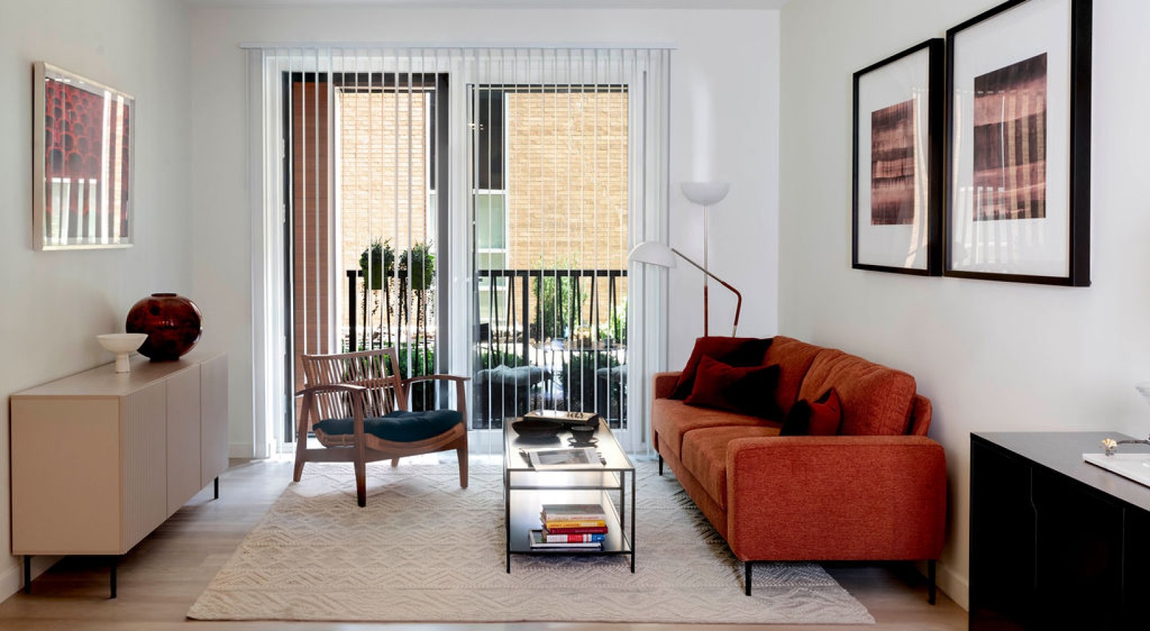 • The Charley Apartments |   A modern living room with a rust-colored sofa, two wooden chairs, and a glass coffee table on a patterned rug. Large windows with vertical blinds provide natural light. Framed abstract art hangs on the walls, and a plant is in t