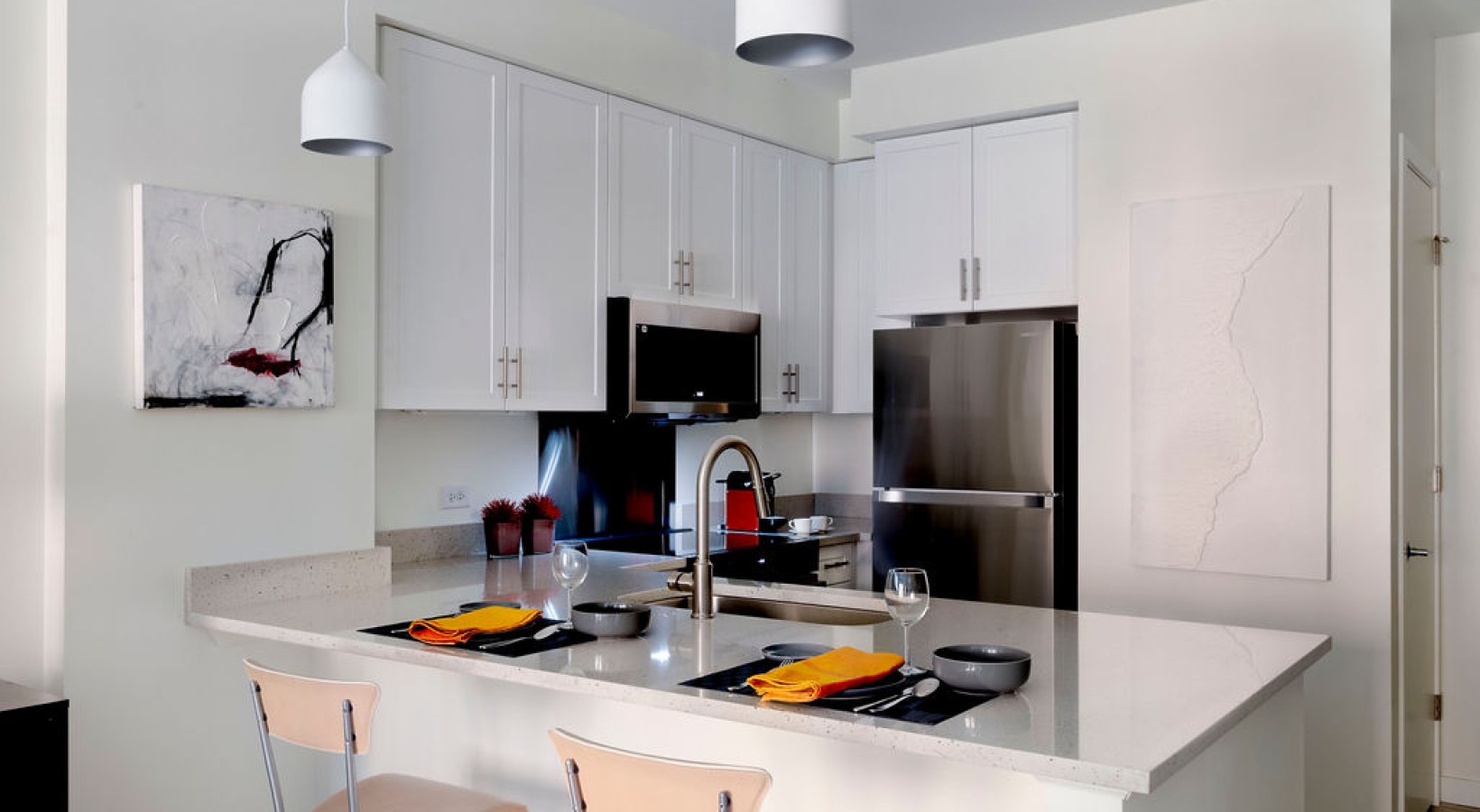 • The Charley Apartments |   Modern kitchen with white cabinets, a stainless steel fridge, and a black microwave. A gray countertop features two place settings with yellow napkins, plates, and glasses. Two wooden chairs are placed at the counter, and pendan