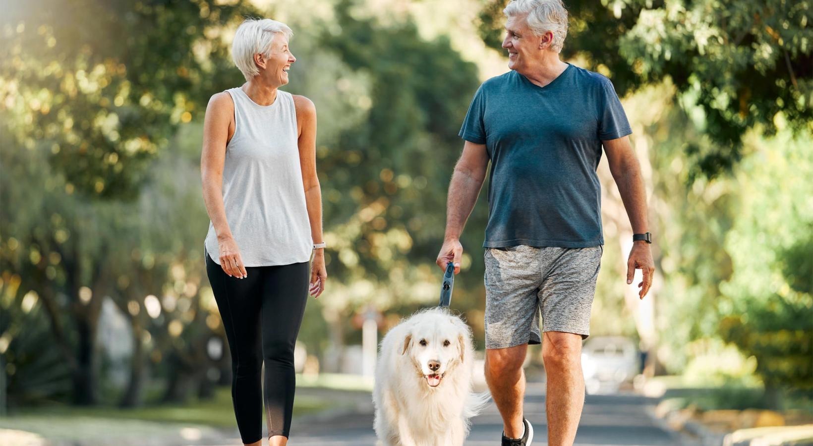 • a man and a woman walking a dog on a leash
