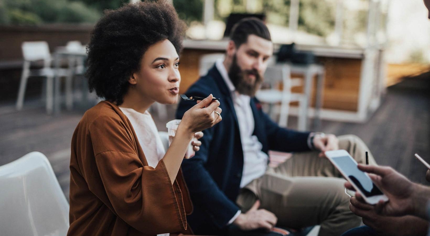 • woman sits and eats outside while someone holding a cell talks to her
