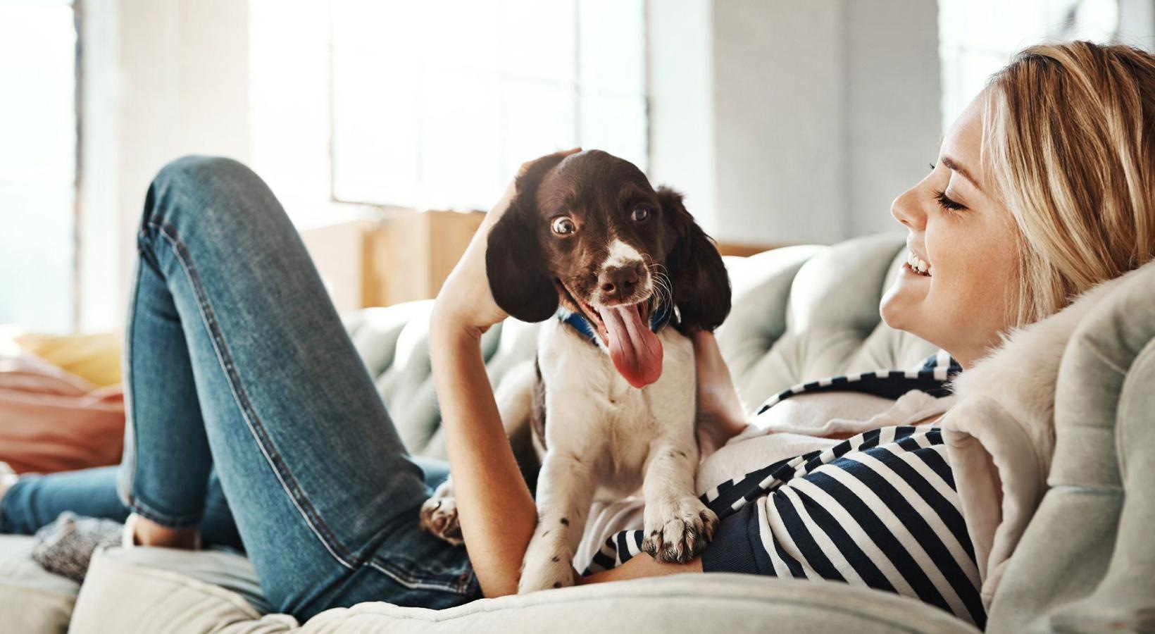 • woman lies on a couch and pets her dog