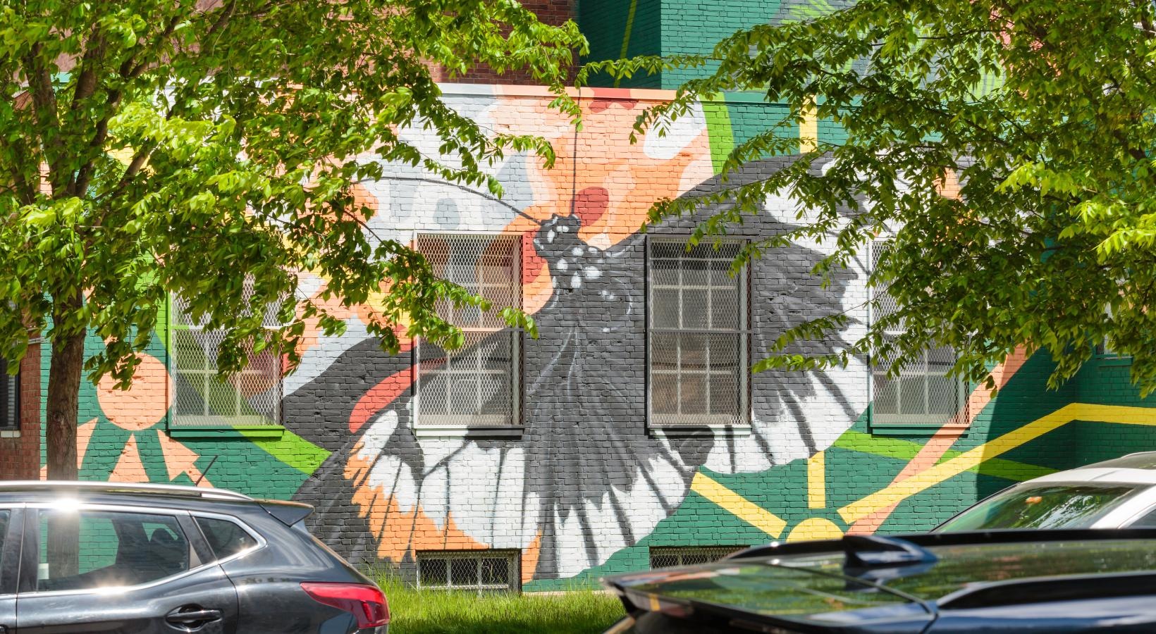 • a building with a hummingbird mural