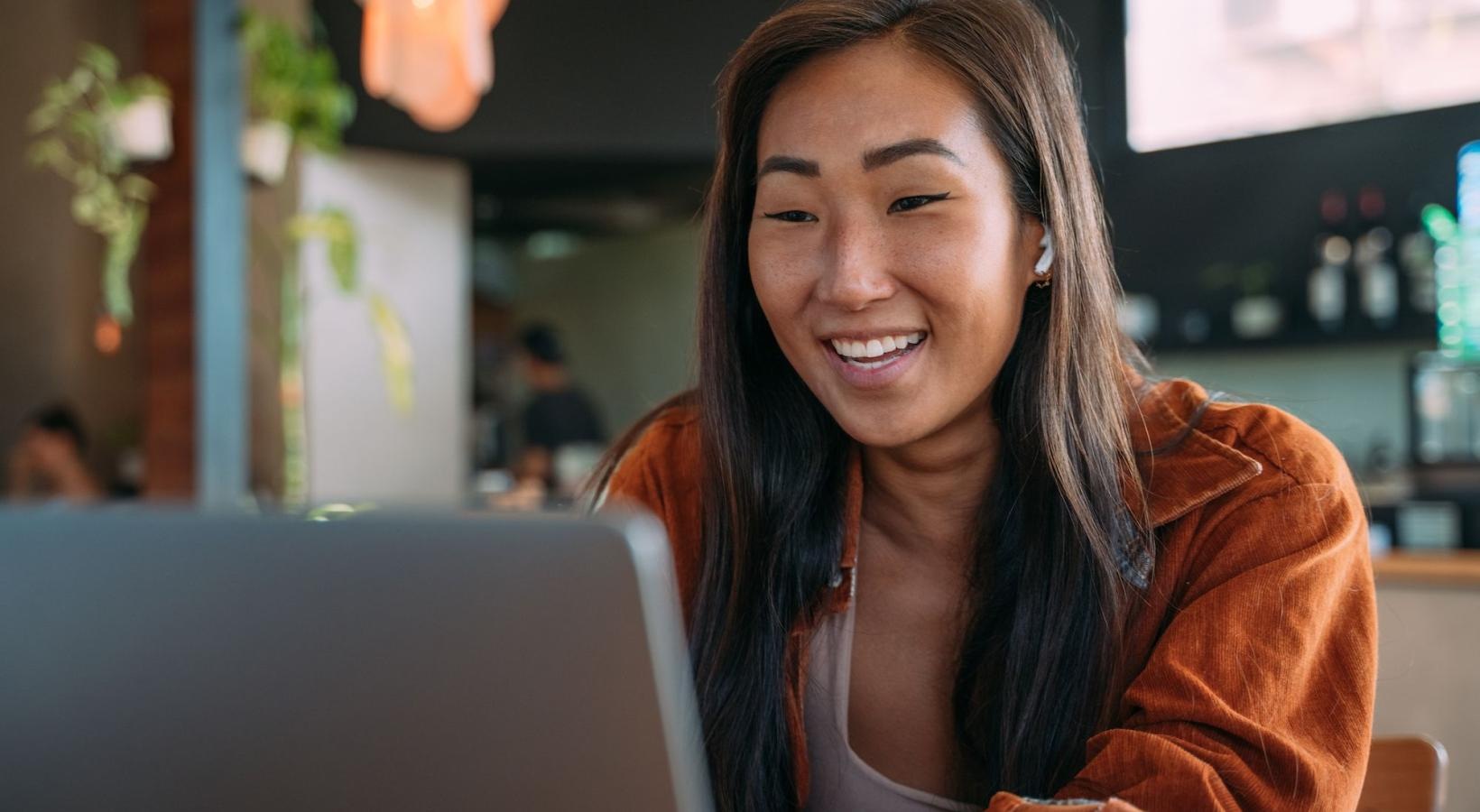 • a woman smiling while working on laptop