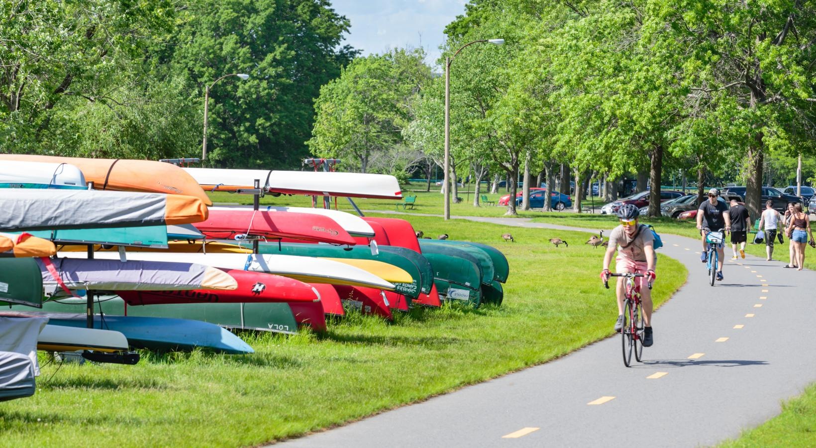 • a group of people riding bikes on a road next to a row of boats